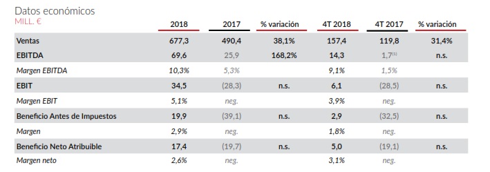 - Sales in 2018 amounted to 677.3 million euros, 38.1% more than in the previous year and the profit was EUR 17.4 million.
